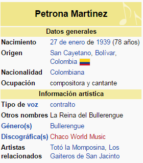 Petrona Martínez ( 27 de enero de 1939) es una cantante afrocolombiana de música autóctona de la Costa Caribe de Colombia.